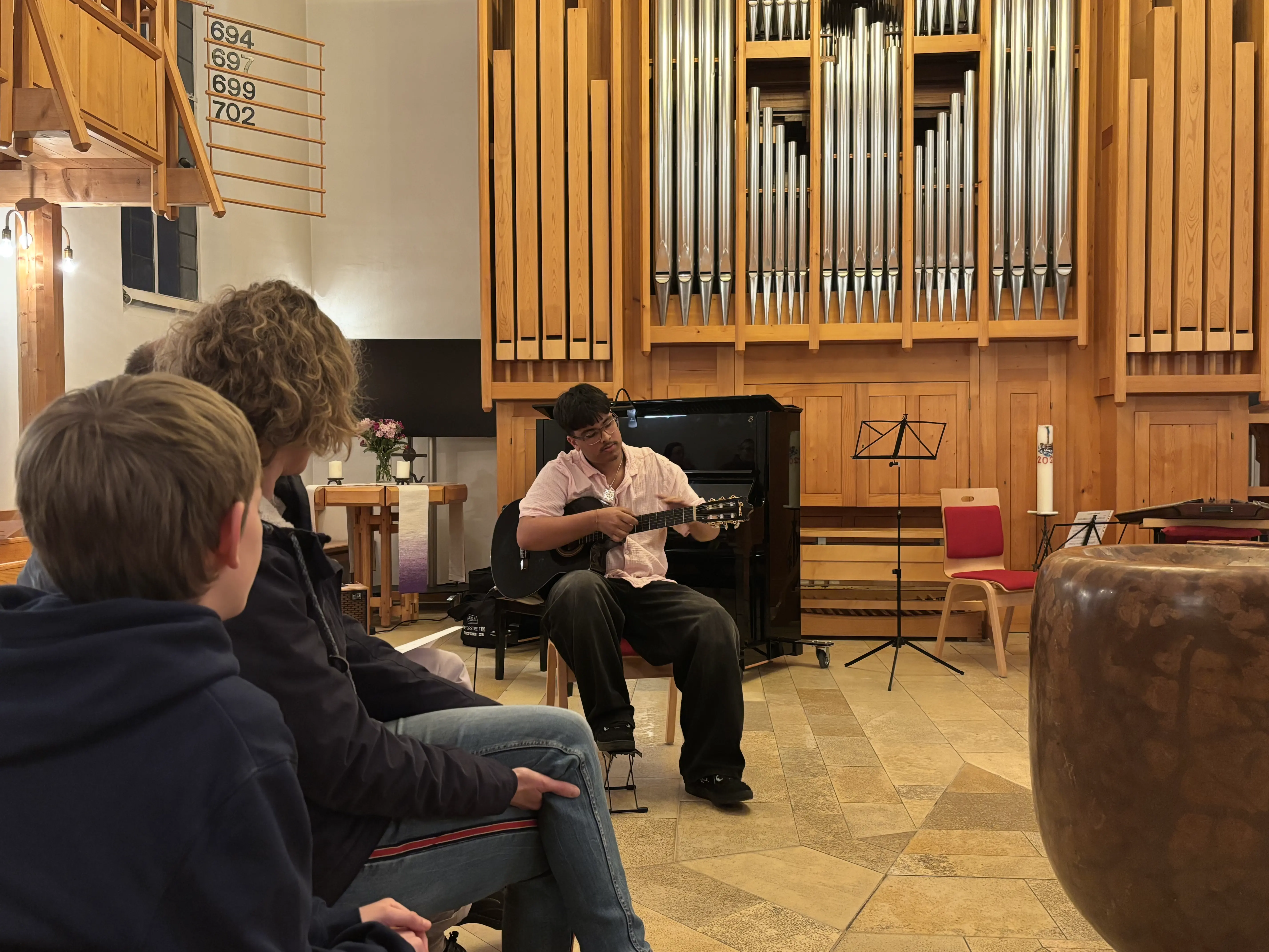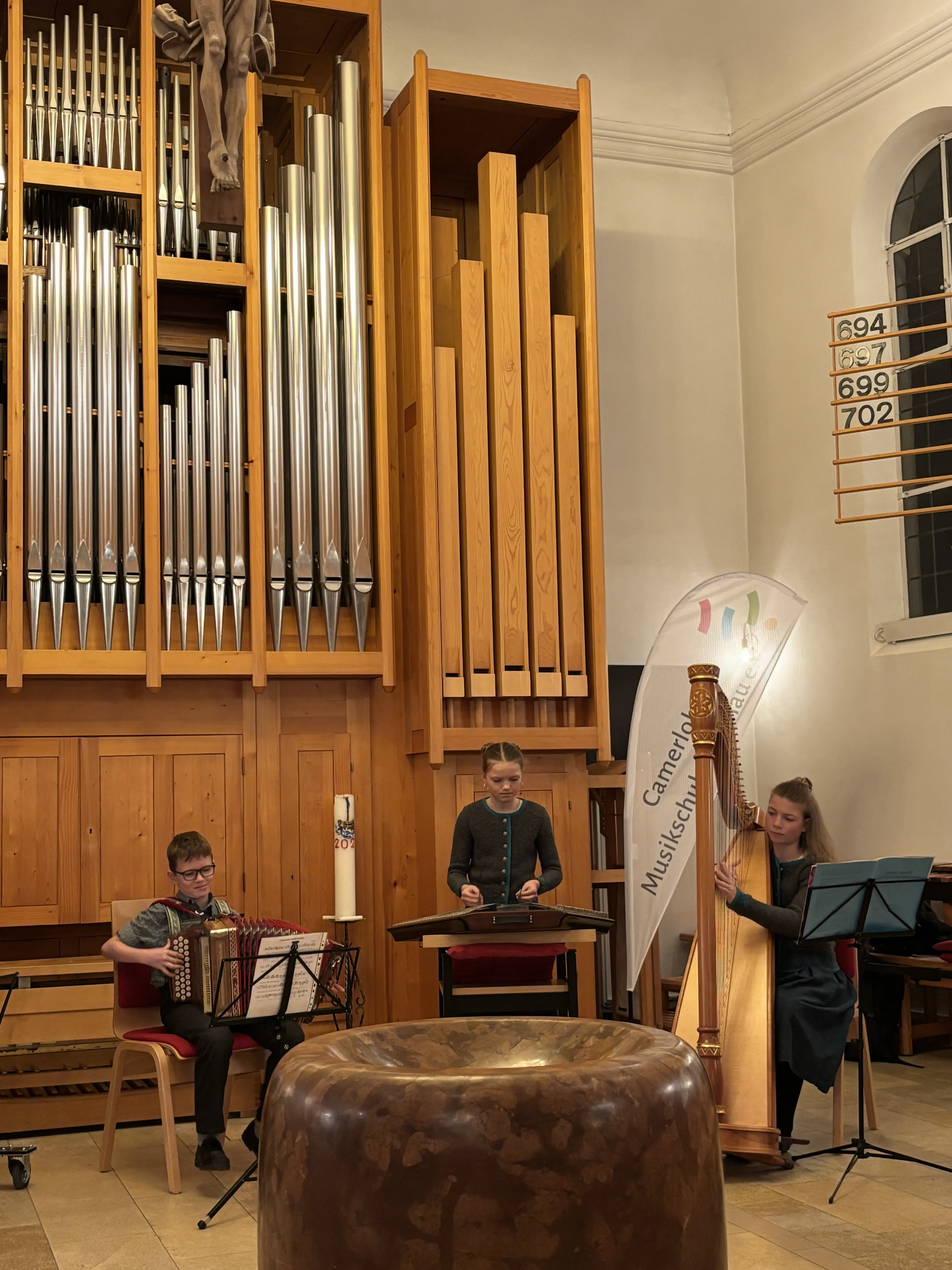 Unsere Schülerinnen und Schüler präsentierten solistisch, im Ensemble und auch mit ihren Lehrkräften gemeinsam ein buntes Programm mit Klavier, Gitarre, Flöten, Violine, Violoncello, Saxophon, Diatonische, Harfe, Hackbrett und Xylophon. Von Barockmusik über die lyrischen Kompositionen von F. Schubert und F. Chopin bis hin zu Volksmusik und moderner Fingerstyle-Gitarre gab es eine spannende Zeit- und Weltreise durch die Musik zu hören.