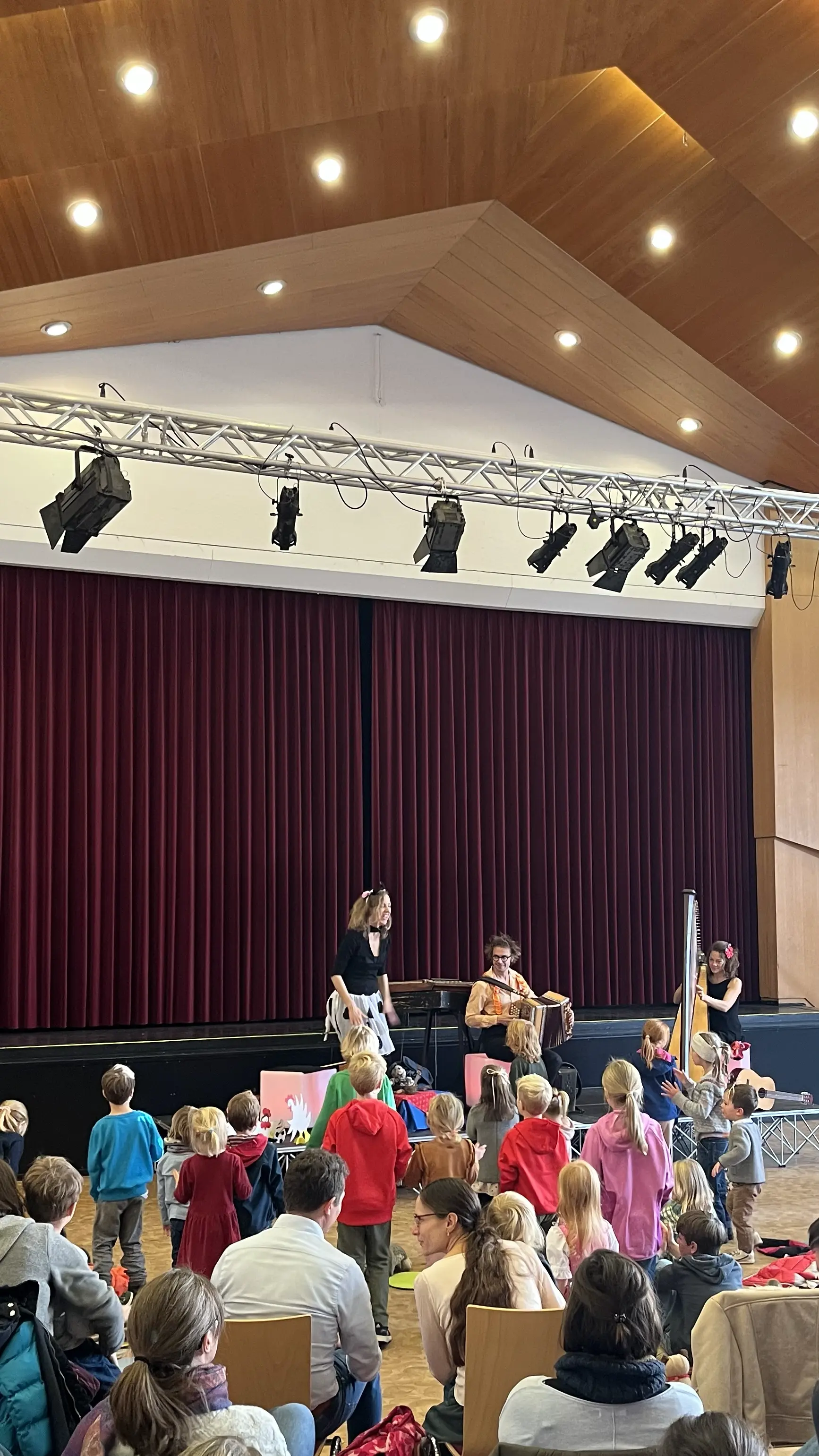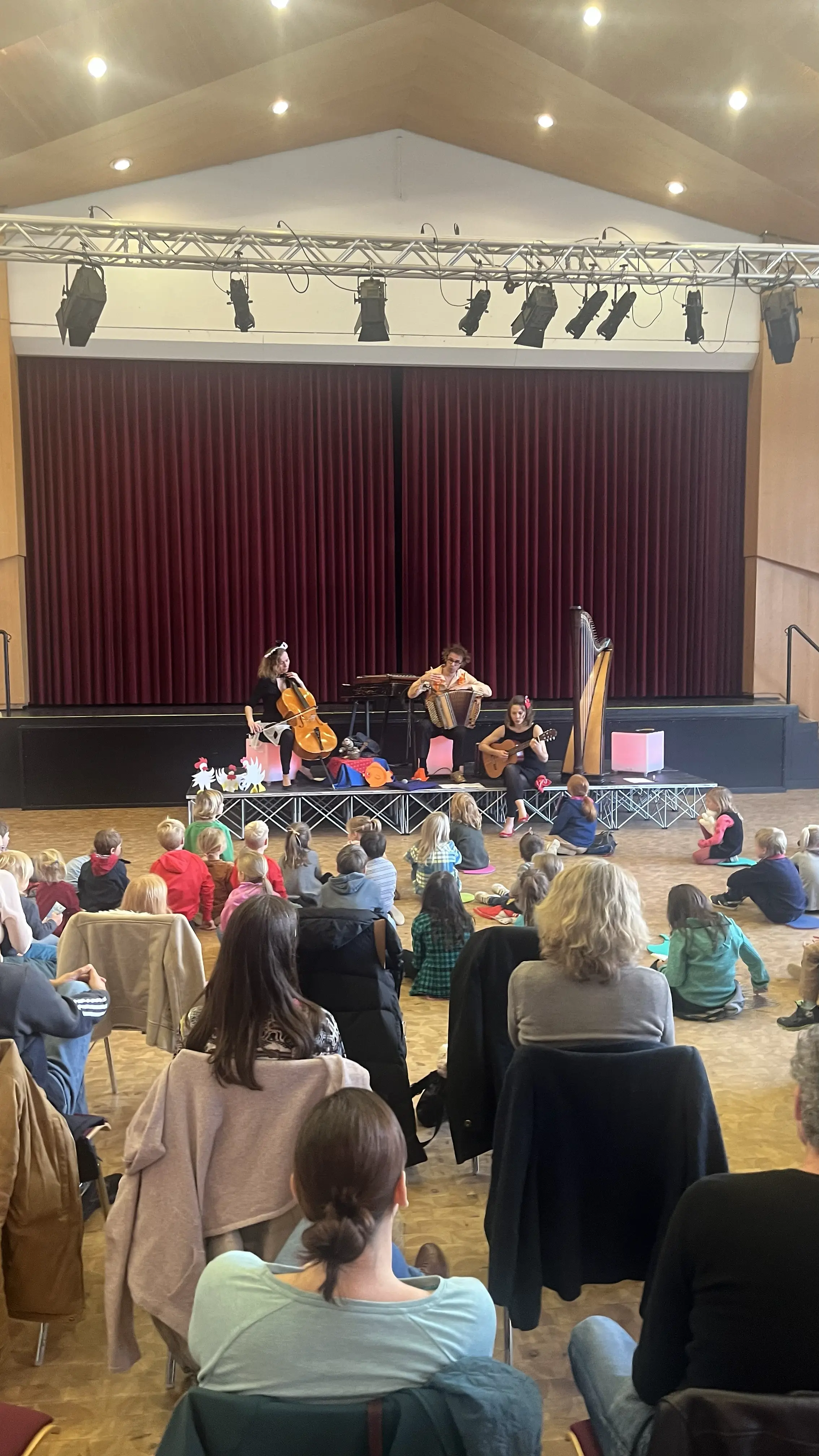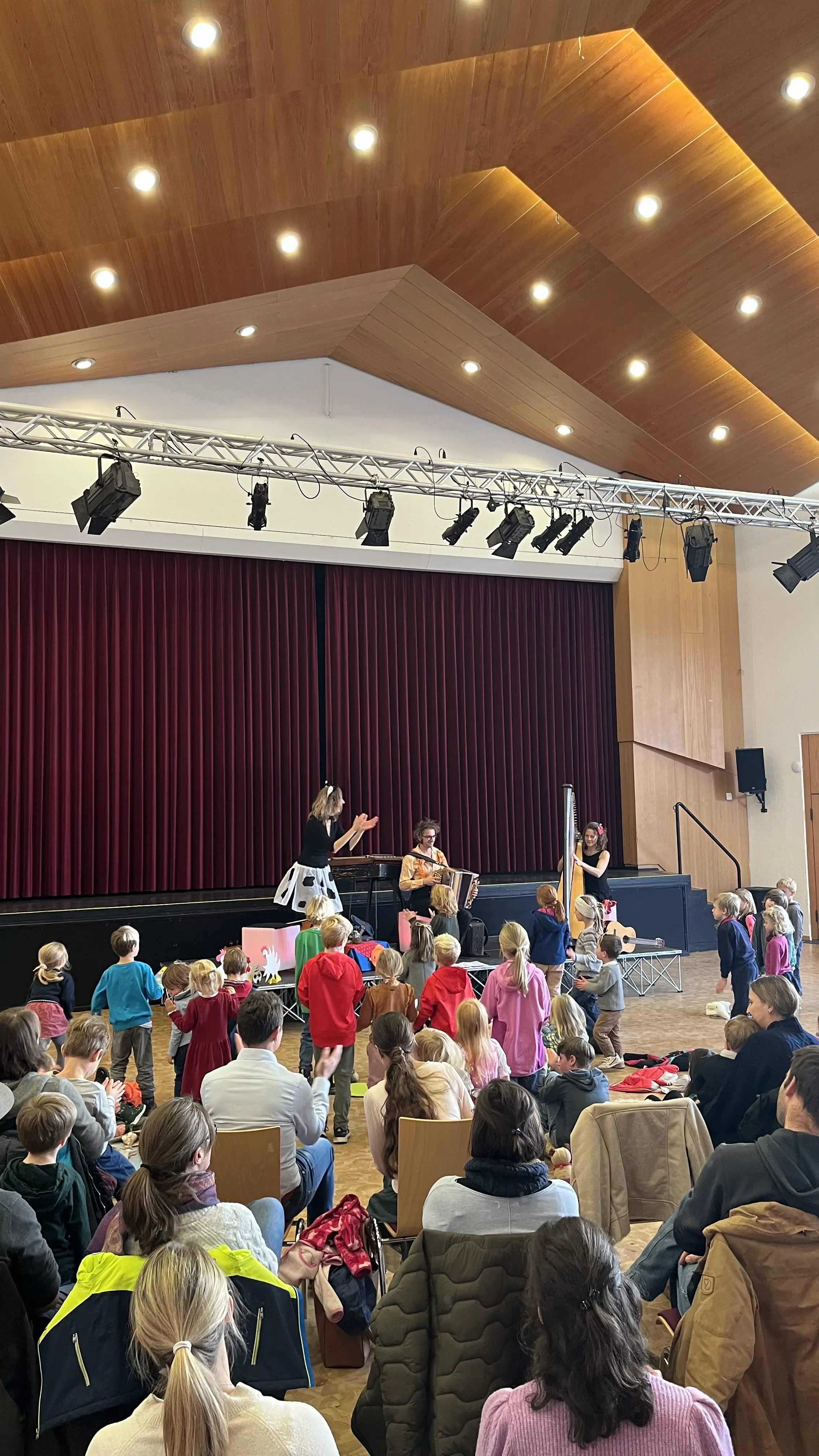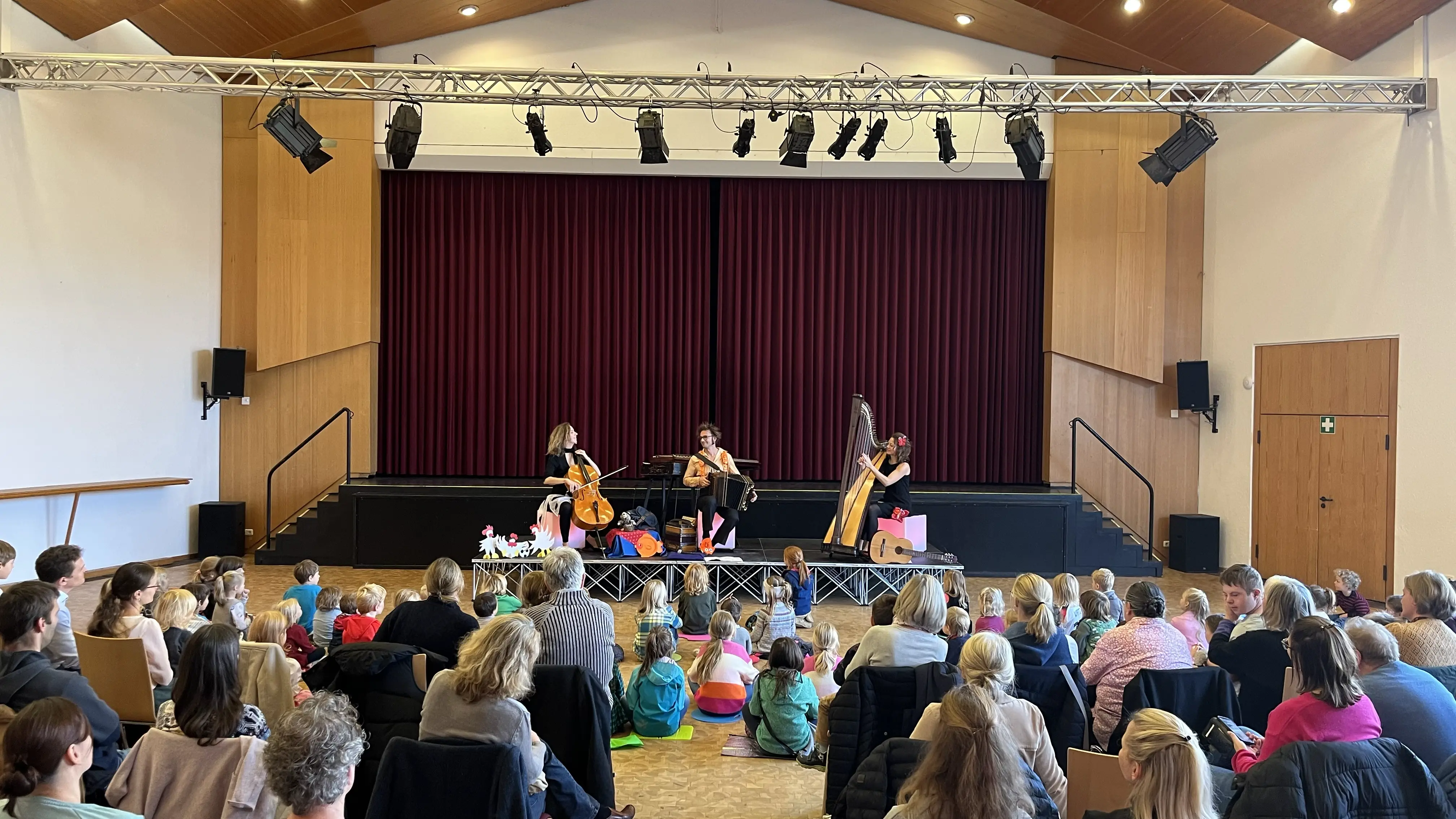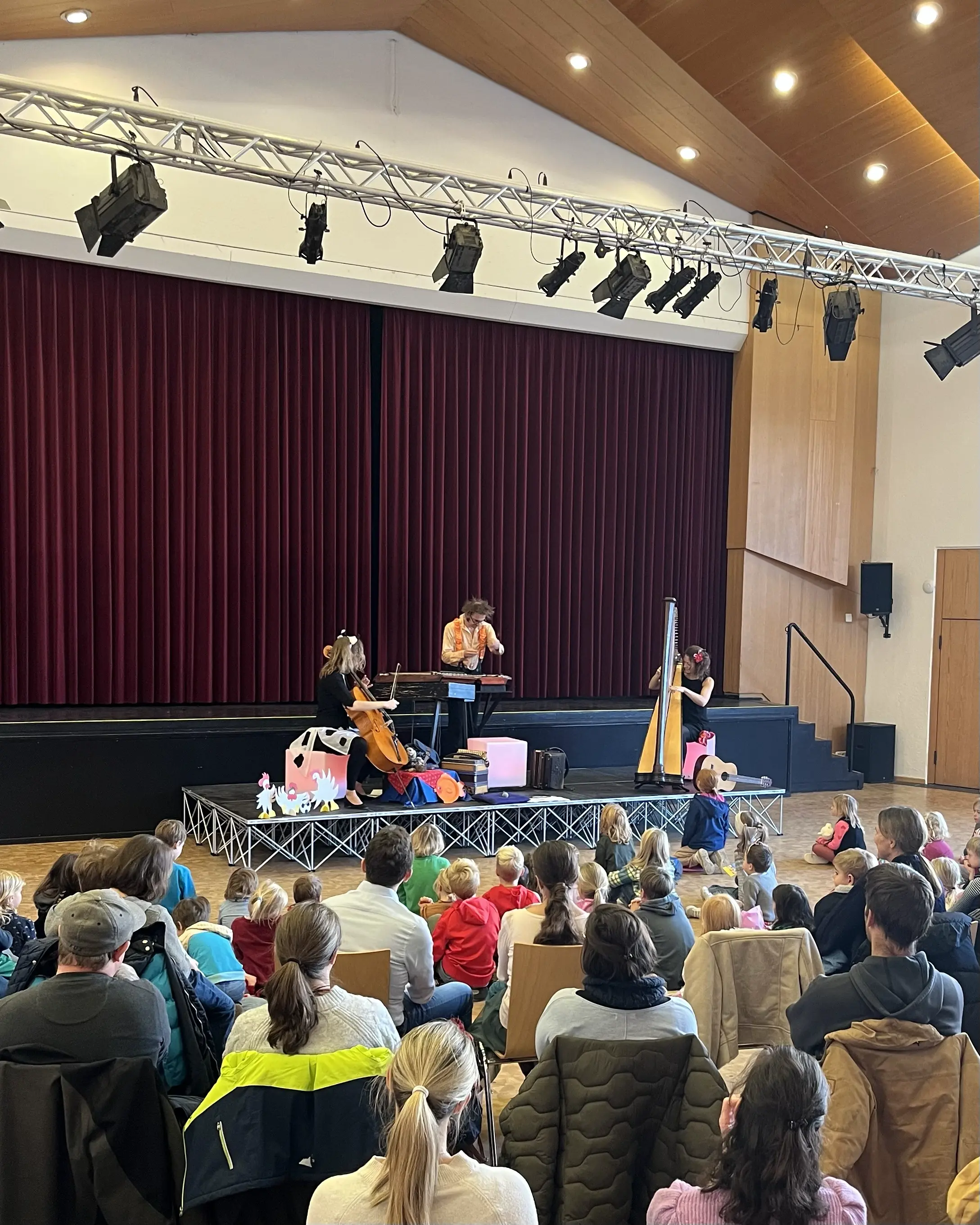 Nach längerer Pause hat es endlich geklappt und die Camerloher Musikschule konnte wieder ein Kindermusiktheater veranstalten. Das Trio „gruberich“, das sich aus Thomas Gruber, Sabine Gruber-Heberlein (beide Lehrkräfte der Camerloher Musikschule) und Maria Friedrich zusammensetzt, präsentierten eine musikalische Geschichte zum Zuhören und Mitmachen für die ca. 150 gespannten Kinder und Erwachsene.